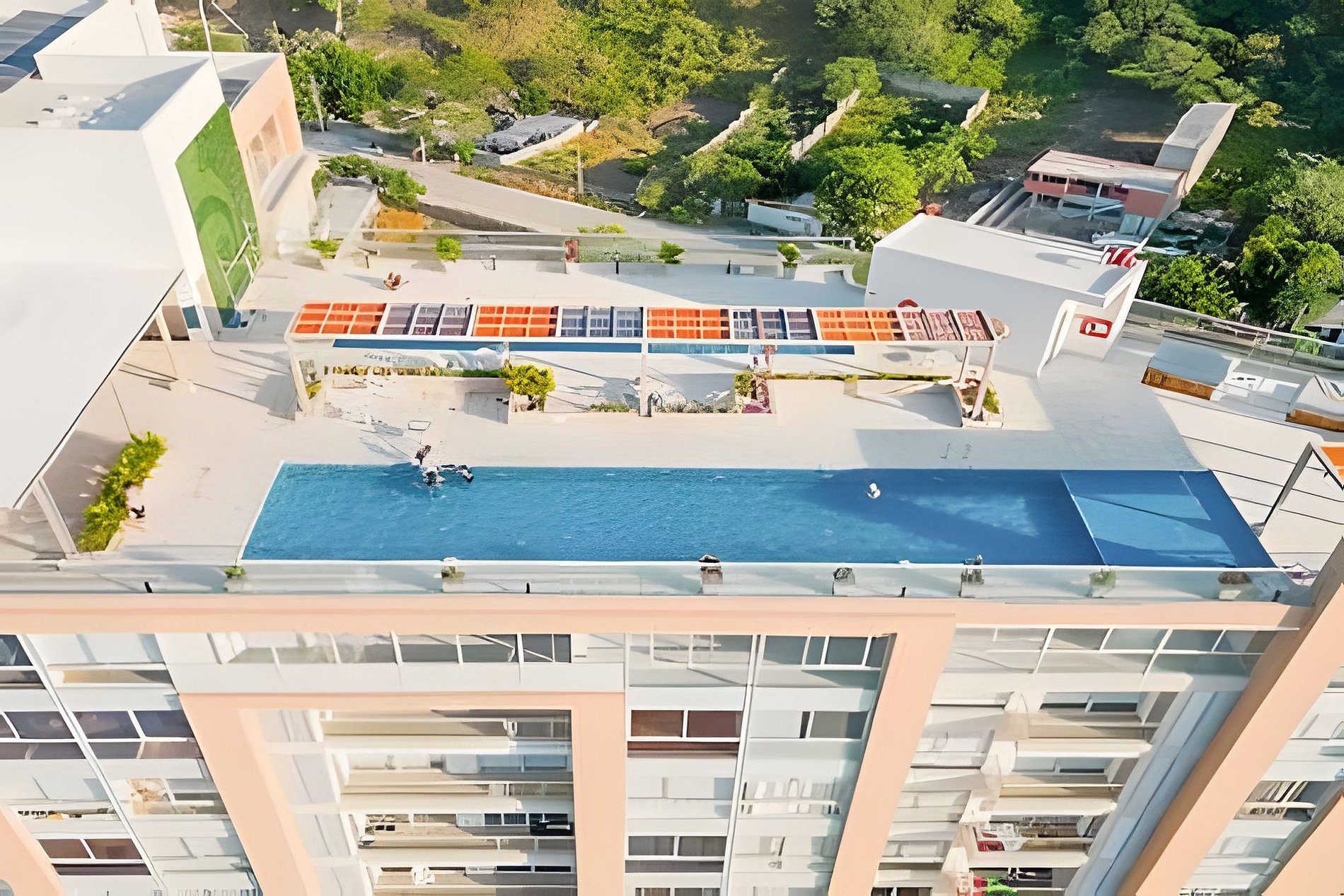 Parqueaderos publicos del edificio, zonas comunes (piscinas, jacuzzis, turcos, zaunas, gimnasio, bar, sala de juegos)